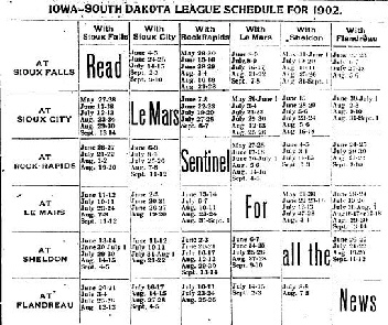 In July, the aforementioned LeMars newspaper reported that league secretary Joe Morton resigned and that he had not been computing the league's individual player statistics. It was left to the new secretary to do so although, since none survived, perhaps no individual stats were ever kept in '02. Sioux Falls banker W.L. Baker replaced Morton as treasurer.